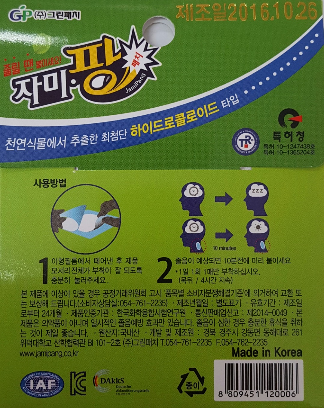 Our Green Patch produces the world's first hydrocolloid-type drowsiness patch that is harmless to human body and maximizes performance by combining patented drowsiness suppression substance made with natural plant extract and cutting-edge hydrocolloid (skin cell activating substance) We are doing. Our company has two patents, one trademark registration and a history of being selected as a small and medium business excellent product HIT500. We have been exported not only to domestic but also to other countries such as Japan. In addition, it has been gradually gaining favorable reception as a promotional product and gift goods by delivery to Samsung F & M, Korea National Road Corporation, Nonghyup Gas Station, Korea Electric Power Corporation and other large corporations and public corporations. Our products have superiority in performance and safety to humans, but they are lacking in publicity. I think it is a waste to stay in Korea and I hope it will be a chance to inform many companies in the big overseas stage.