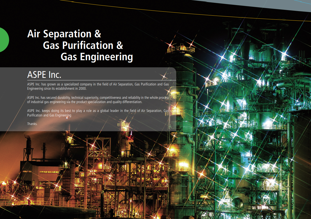 Welcome ! Welcome to our e-catalog home. Here you can find information about our products. You can also send us inquiries and post comments about our company and products. We hope you enjoy your visit. Aspe Inc. is installed based on air separation and gas purification technology. It is a gas engineering company that has grown by operating a package until a test run. Our ASPE is a company that stably increases sales by possessing the world's best technology so as not to be shaken by any changes in the economic environment. By actively discovering and nurturing new growth engines through global marketing, we will develop into a company with the highest value.